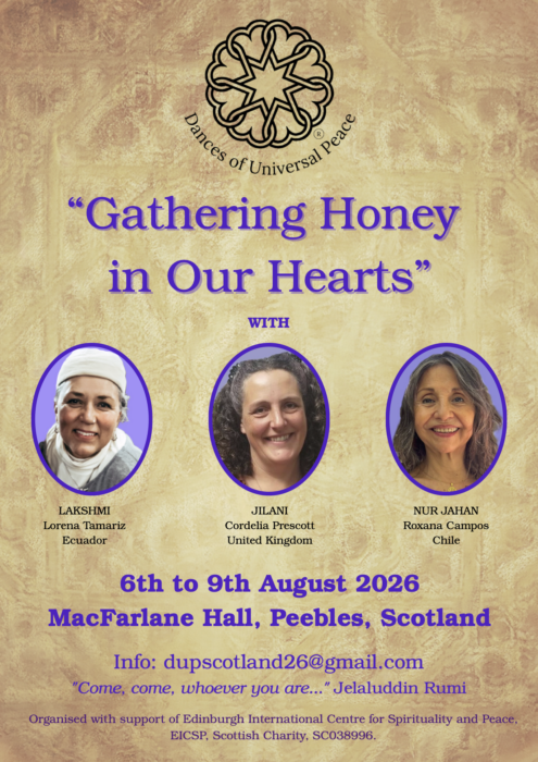 Welcome to this International Dances of Universal Peace event in Scotland, 6-9 August! Why not make it the excuse for a visit to this beautiful and ancient country! It’s a wonderful gathering of senior leaders, Sufi guides and musicians from Latin America – a rare and precious opportunity for us here in the UK. It promises to be a magical time in the beautiful Scottish landscape, and a wonderful initiative, bringing new growth and energy to revitalise the Dances of Universal Peace community here in the UK. Please support us! Sign up today! For info and bookings, contact Moira: dupscotland26@gmail.com