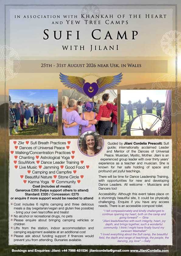 This event is offered in association with Khankah of the Heart, a UK Sufi community based not in bricks and mortar, but in the loving hearts of everyone who feels part of it. Through Khankah of the Heart we may be able to offer some bursaries for those who would otherwise be prevented from attending this camp by the cost. Please ask!